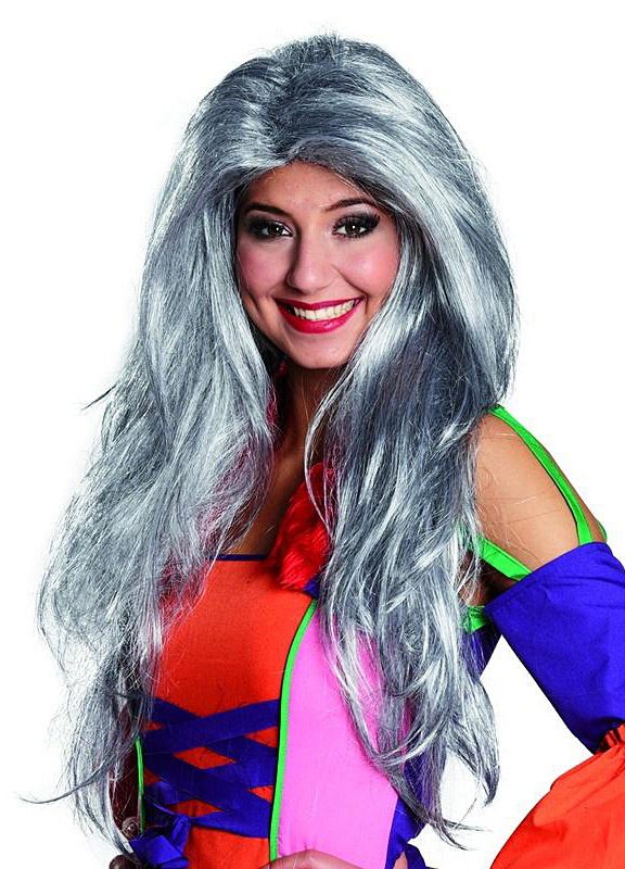 Dlouhovlasá paruka s tmavěšedými vlasy přechází na dlouhé světlešedé lokny.