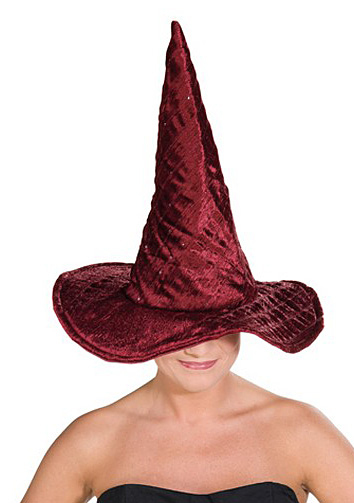 Sametový čarodějnický klobouk s ozdobnou stuhou s nýtky a šněrováním. Max. velikost 59 cm.