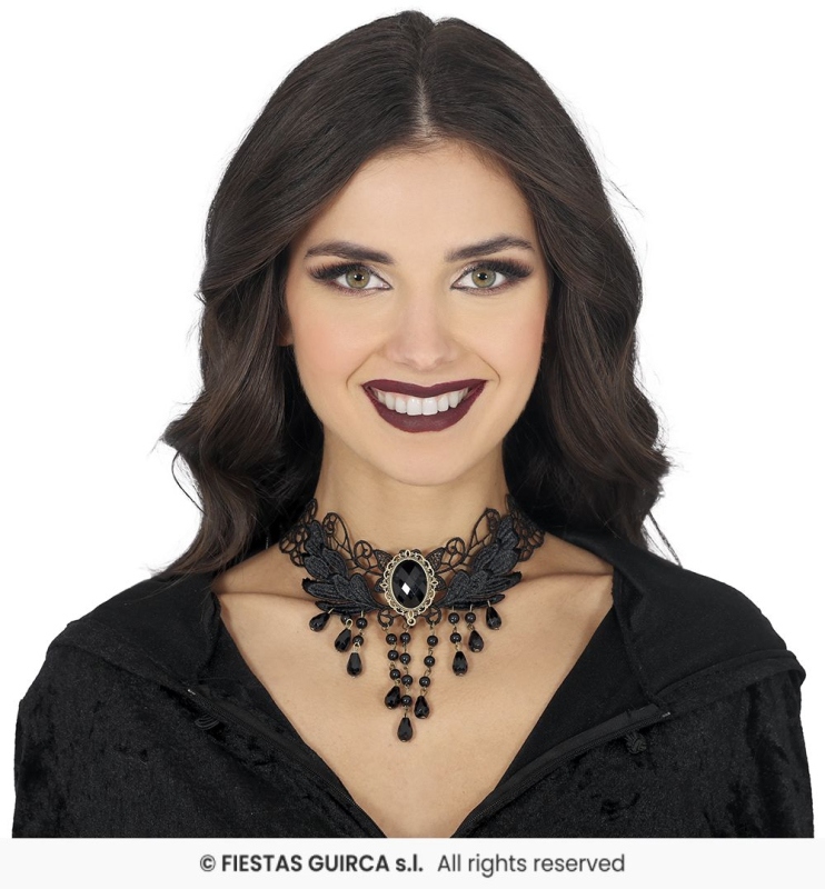 Gumový náhrdelník s řetízkovým zapínáním. Vytváří efekt uřezané hlavy.