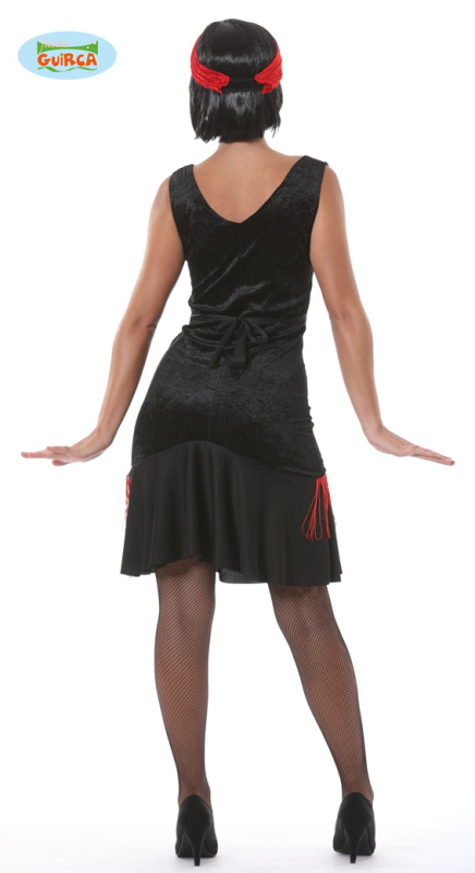 Asymetrické šaty ve stylu 20.-tých let. V horní části s flitry, vespod, na bílé sukni jsou tři řady širokých černých třásní.