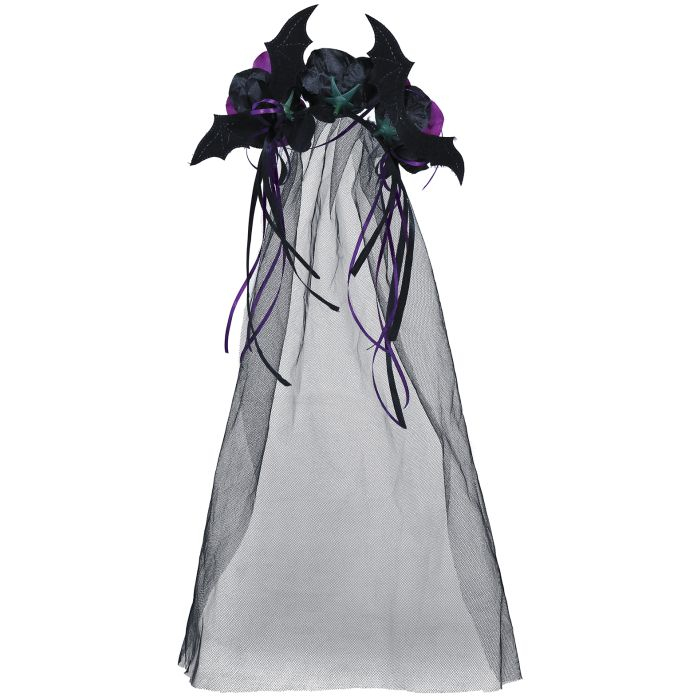 Fialový čarodějnický klobouk s barevnými nášivkami. Široký okraj je zdobený zeleným tylem a červeným marabu.
