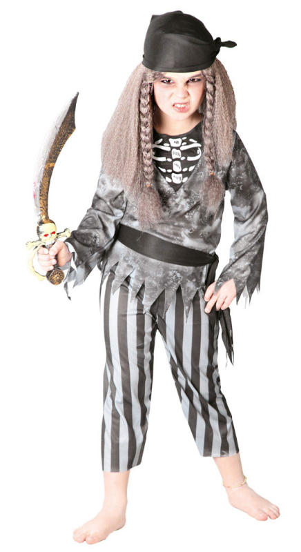 Pirátský set obsahuje červený šátek s motivem lebky, plastovou klapku na oko a zlatou naušnici.