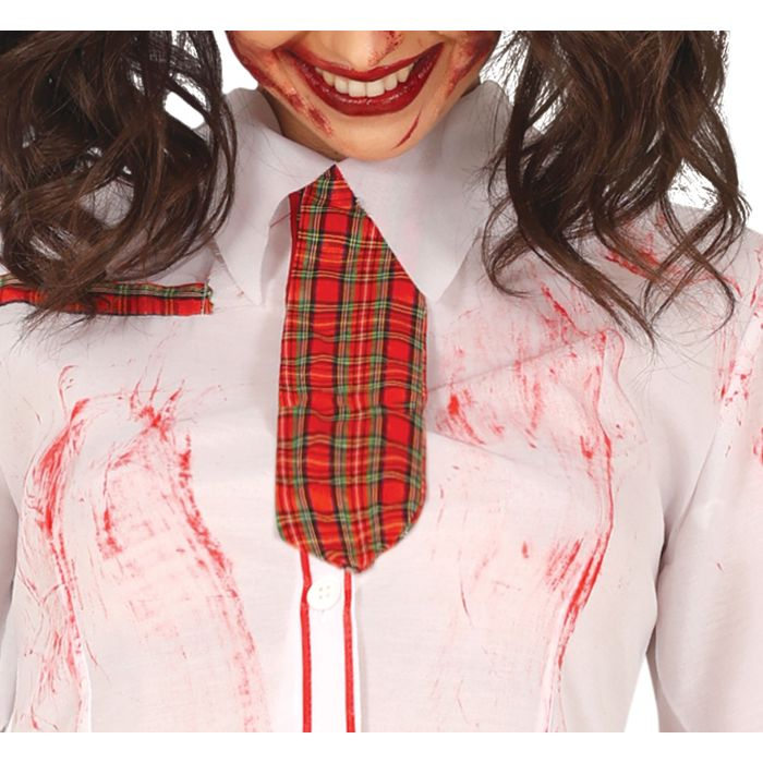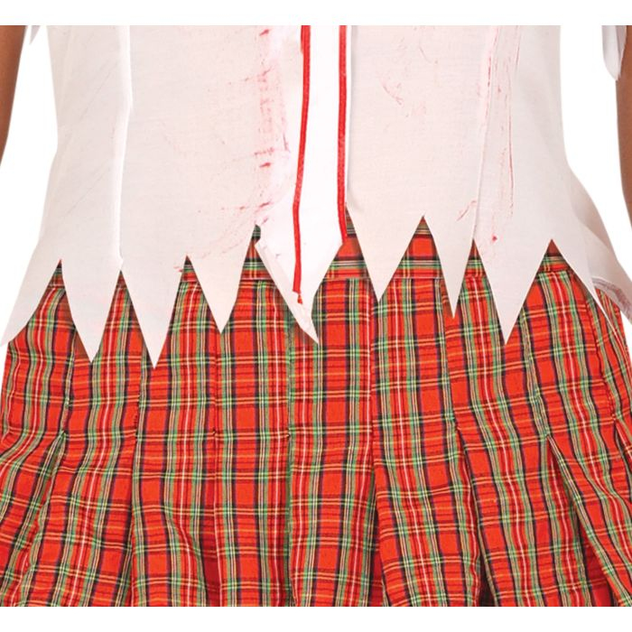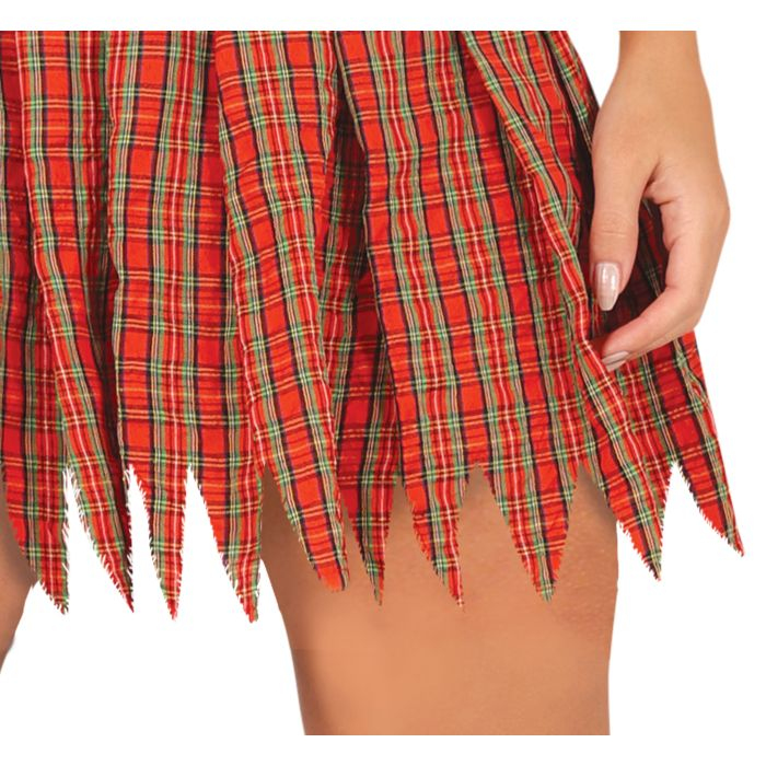 Zelenobílý kostkovaný dirndl s ozdobným okrajem, výšivkou a ozdobným šněrováním vpředu. Krátká červená dirndl halenka s krajkovým lemem na nabíraných rukávech. Součástí je dlouhá zástěra z lesklé červené látky se zeleným lemováním a zavazovačkami, které lze zavázat na velkou mašli.