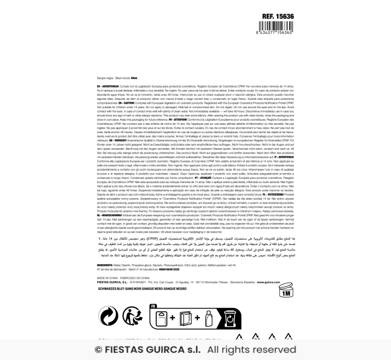 Krev ve spreji - obsah 60 ml. Není vhodná pro děti do 14 roků. Nepoužívejte v blízkosti očí. Nepolykat! Krev může zanechat skvrny na některých textiliích.