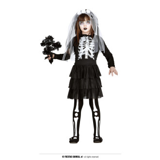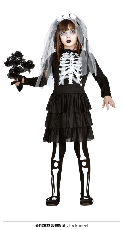 Nápaditě zdobené šatičky Skeleton s potiskem na hrudníku, flitrovými rukávy a sukní a stříbrným opaskem. Legíny jsou součástí kostýmu. Další velikosti viz. 85810, 85811.