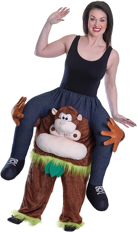 Vtipný kostým gorily nesoucí člověka. Kalhoty s naznačenýma nohama a postavou gorily.
