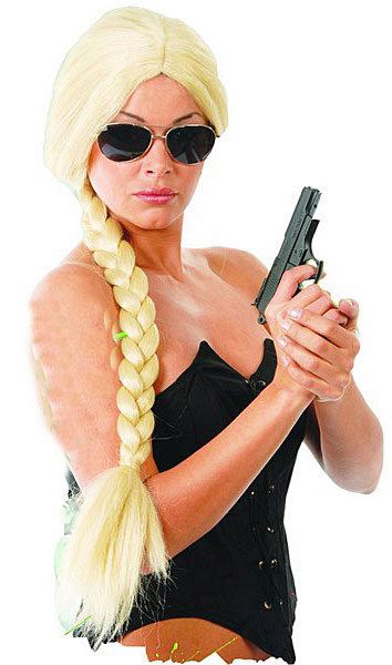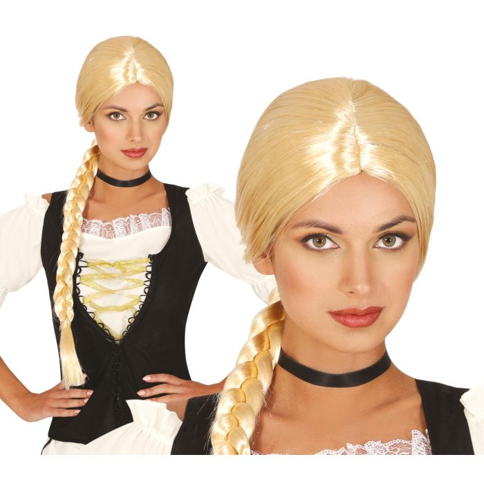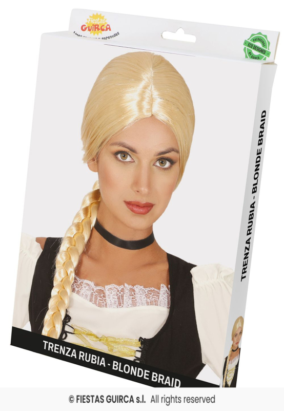 Kudrnatá tyrkysová dlouhovlasá paruka s černými prameny, zdobená různými květy.