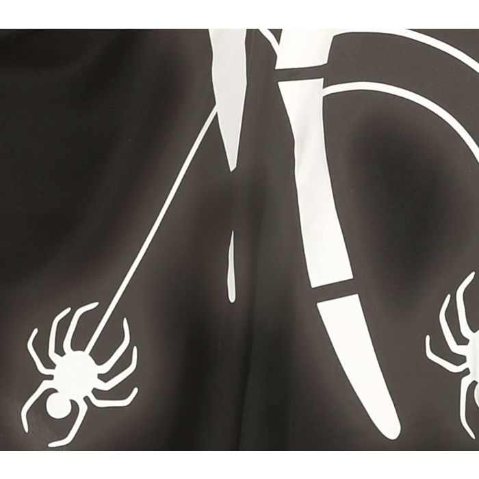 Dvoudílný černý kostým rappera. Top s kapucí a kalhoty mají bílé manžety a jsou potištěny velkými znaky dolaru a zlatým náhrdelníkem s přívěskem lebky.