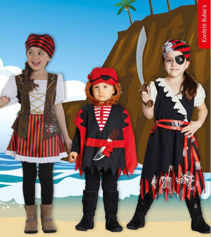 Krásný a nápaditě zdobený pirátský kostým se stříbrným potiskem a lemováním. Obsahuje červený kabát s všitou halenou a pirátský šátek.