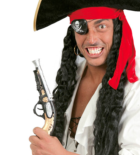 Pirátský set obsahuje červený šátek s motivem lebky, plastovou klapku na oko a zlatou naušnici.