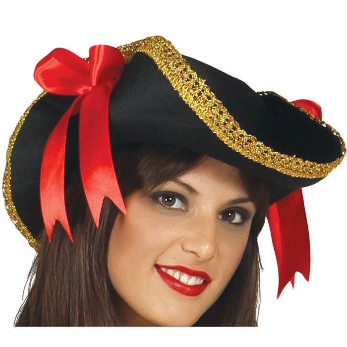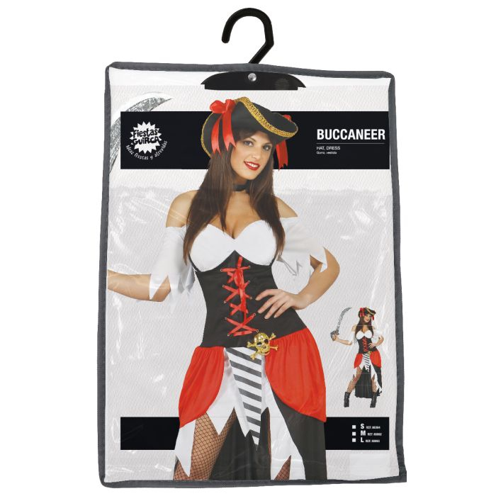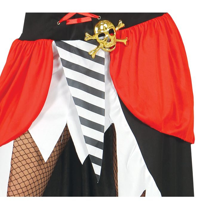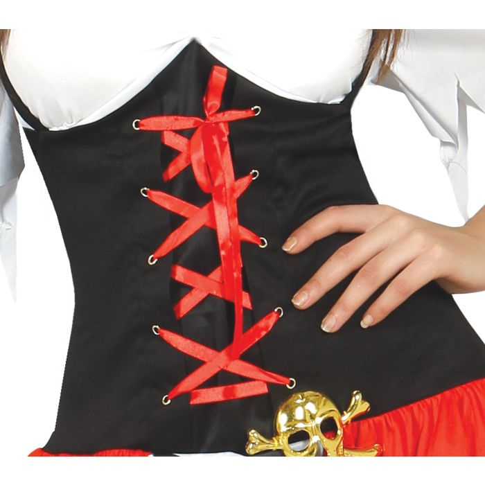 Pirátský set obsahuje červený šátek s motivem lebky, plastovou klapku na oko a zlatou naušnici.