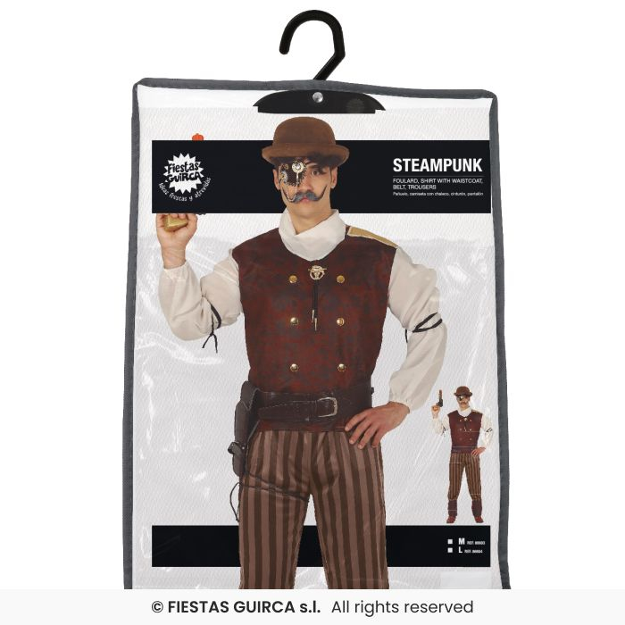 Kalhoty, vesta, kabát, fiži, "boty". Vesta - pas 106, délka 70 cm. Košile - pas 132, délka 74 cm. Kalhoty - pas 81 - 104, délka 91 cm. Kabát - pas 110, délka113 cm. Vhodné pro velikost M, L, XL.