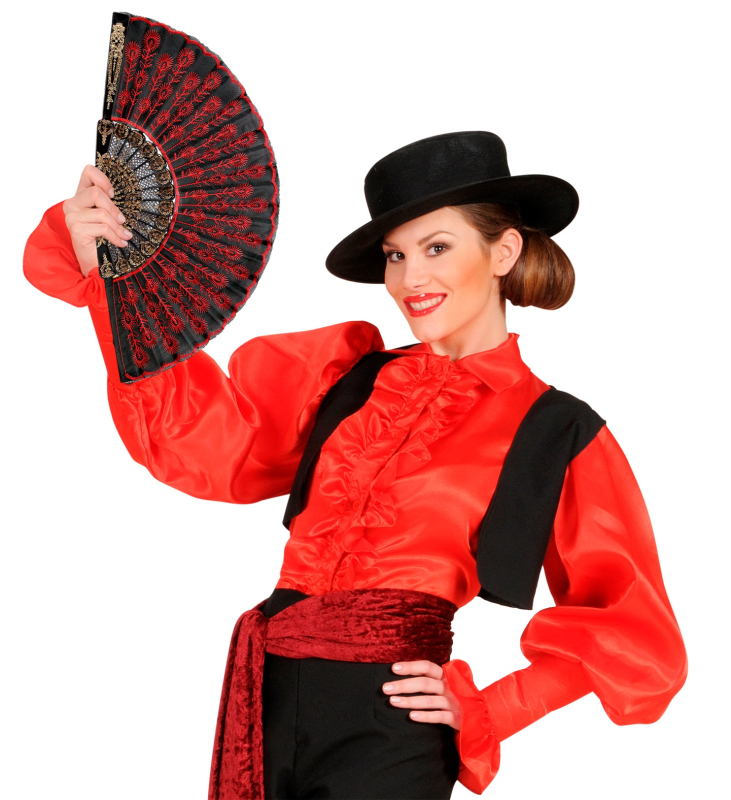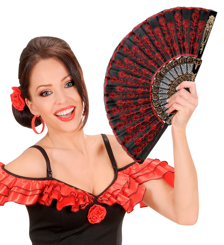 Krásný vějíř se zlatým zdobením. Z průhledného materiálu s zlatou dekorací růžemi. Tkanina má lehce barevný nádech.