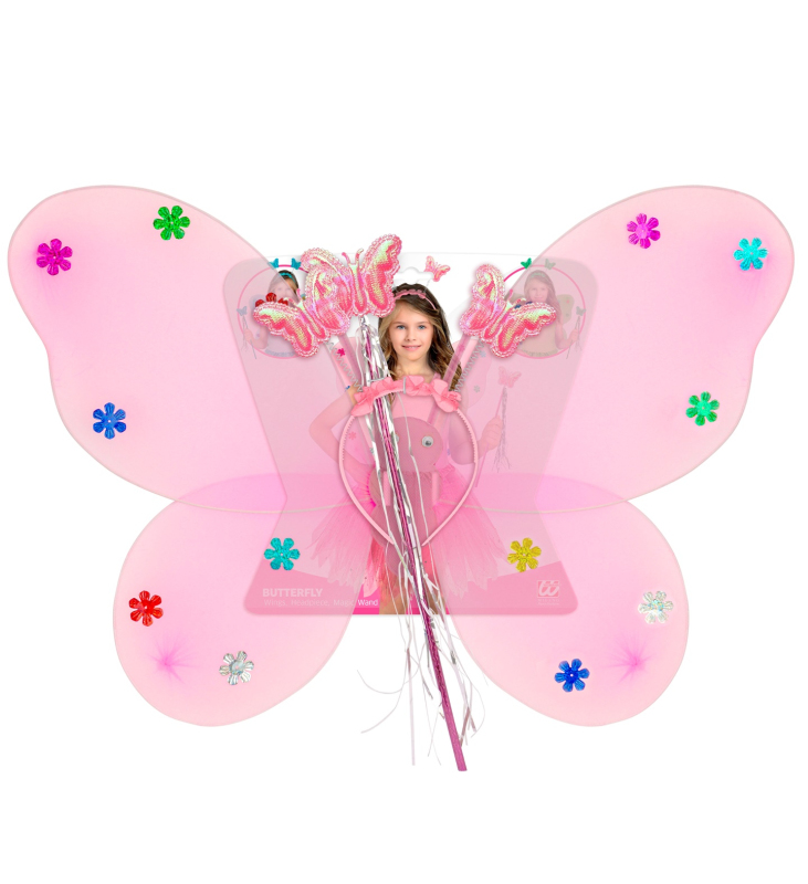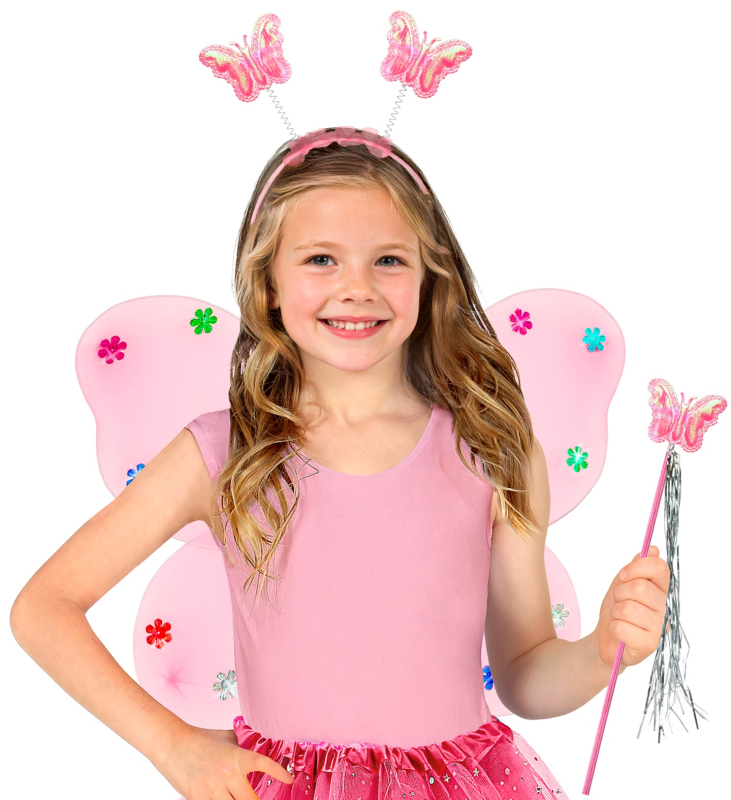3dílná růžová sada křídel pro děti. Na čelence jsou na spirálových pružinách připevněny dvě hvězdy z lesklé látky. Kruh je ozdoben bordurou marabu. Na vrchoůu hůlky je připevněna lesklá hvězda a stuhy. Průhledná křídla jsou zdobena hvězdičkami.