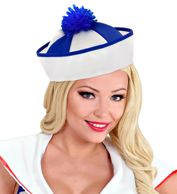 Bílá čepička se dvěma červenými pruhy, v přední části je našita flitrová kotva.