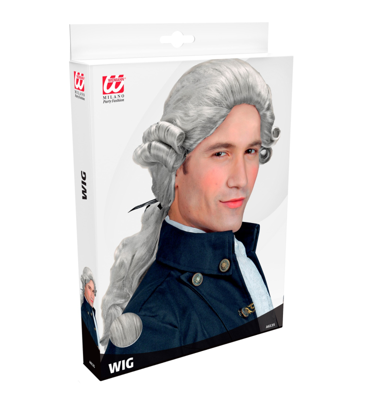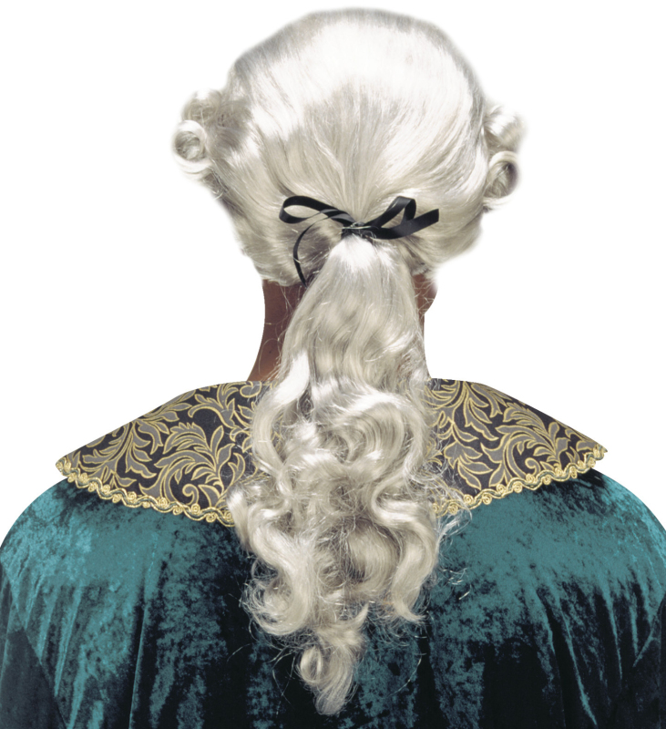 Bílá paruka na gumové podložce. Obočí a knír nejsou součástí paruky.