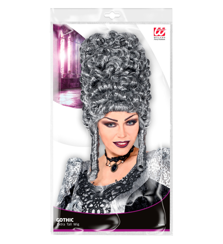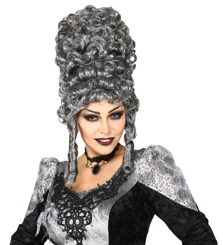 Mátovězelená paruka s dlouhými vlasy a růžovými prameny. Vlasy jsou vlnité.