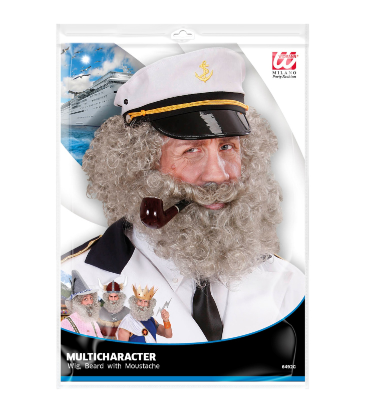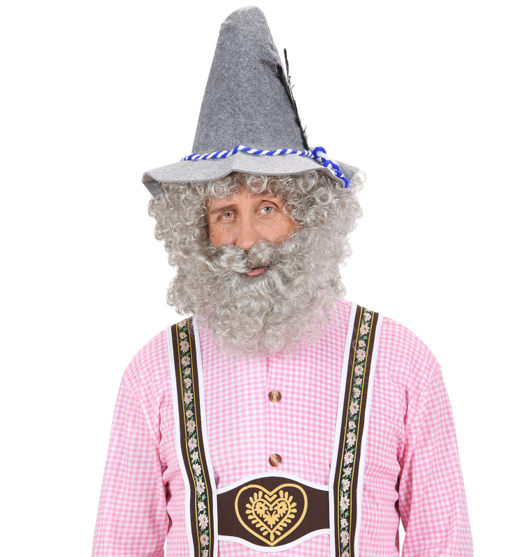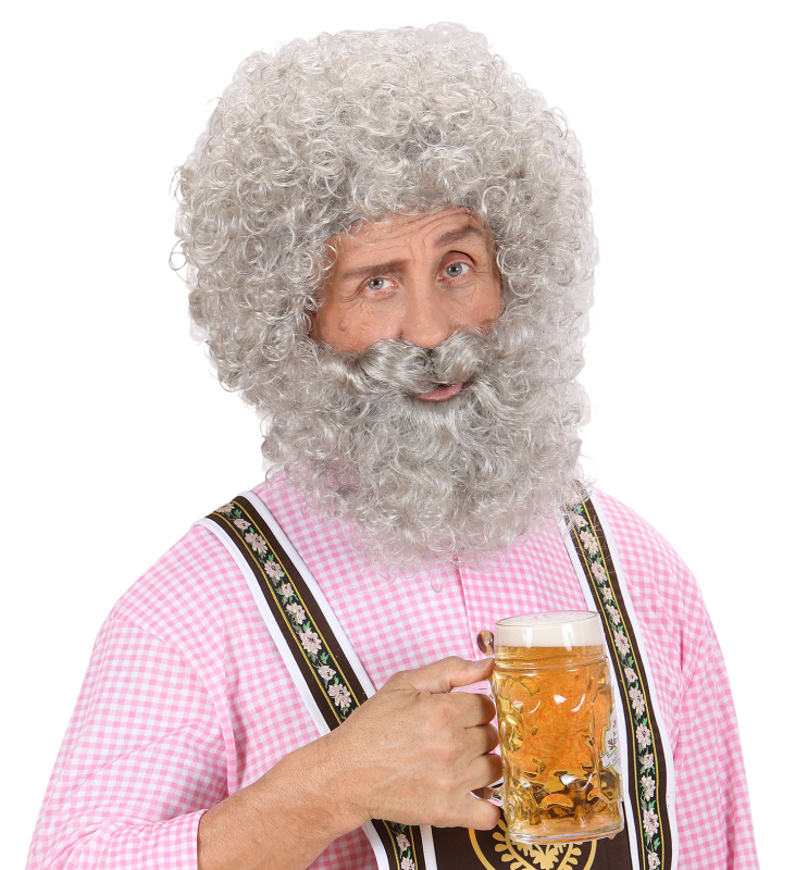 Bílá paruka na gumové podložce. Obočí a knír nejsou součástí paruky.